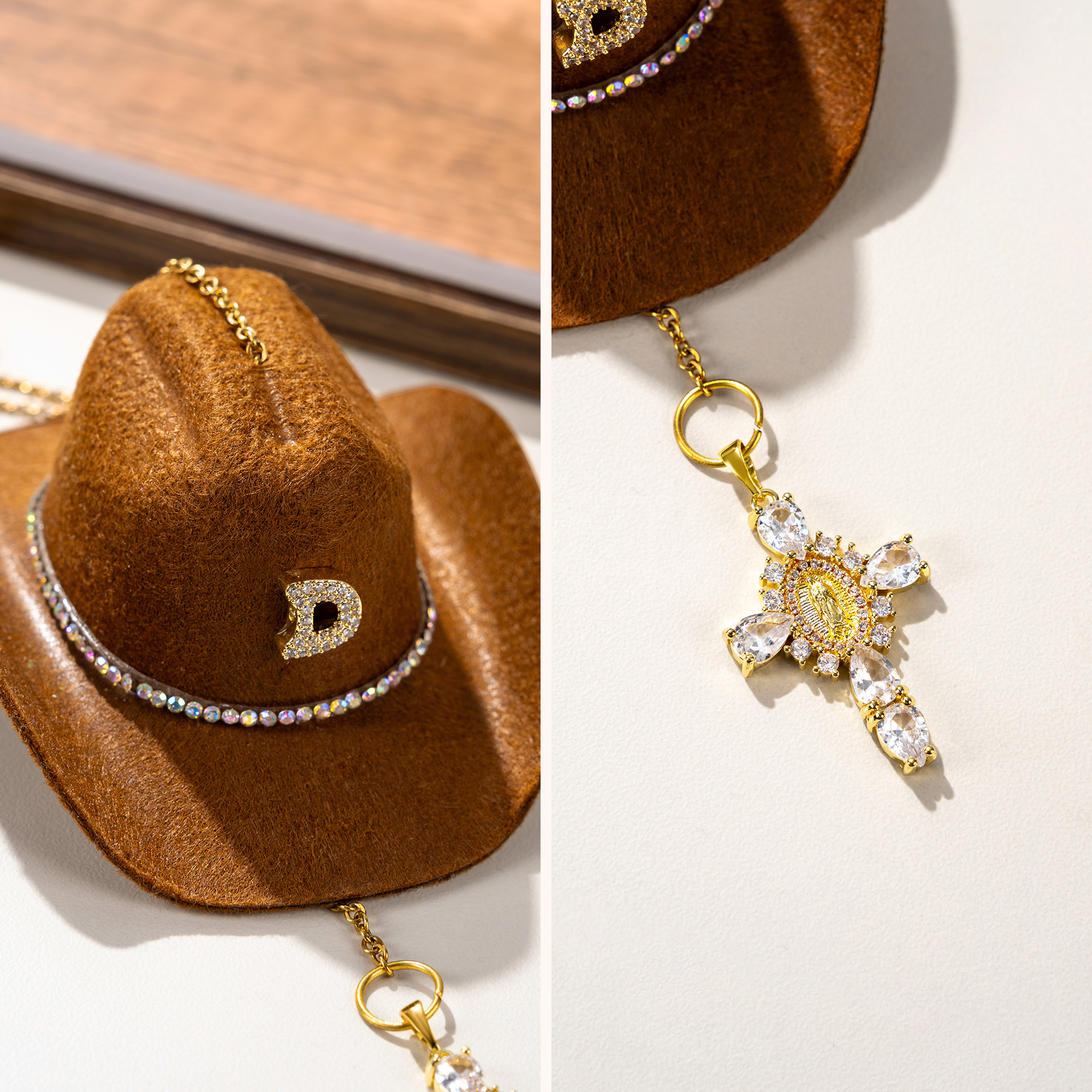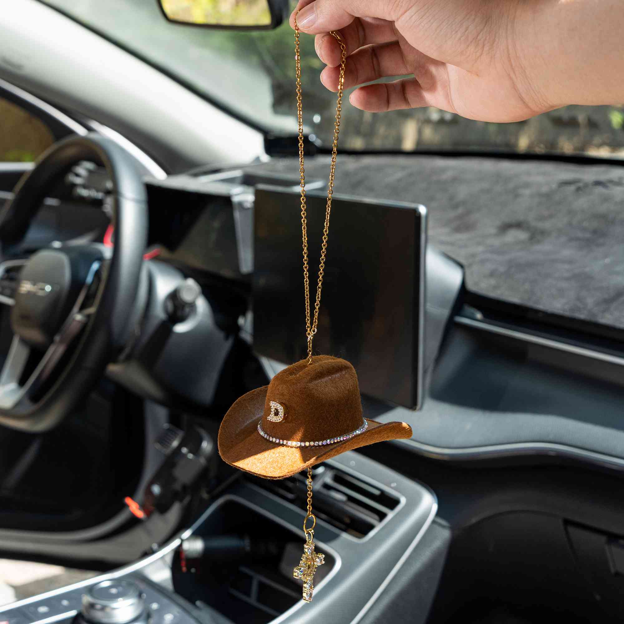 Custom Initial Virgin Mary Cross Car Charm with Mini Cowboy Hat