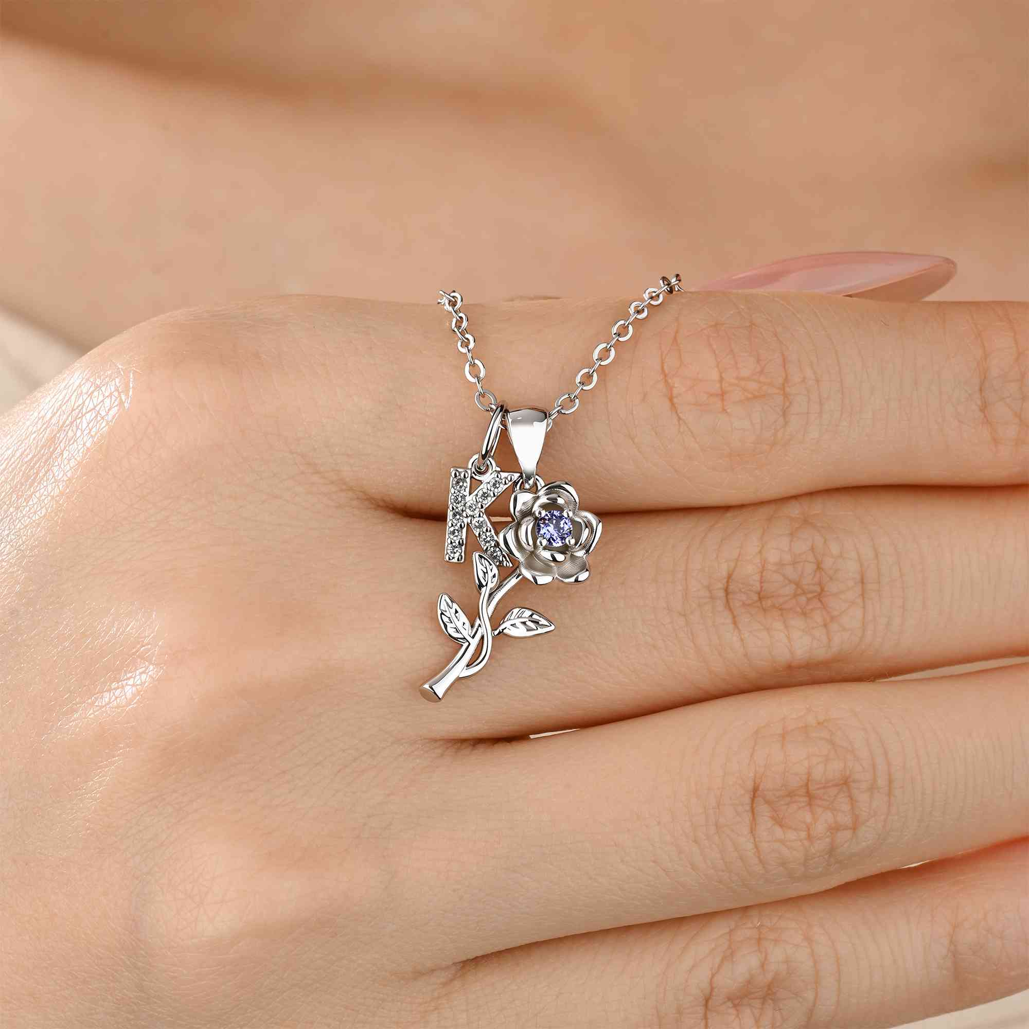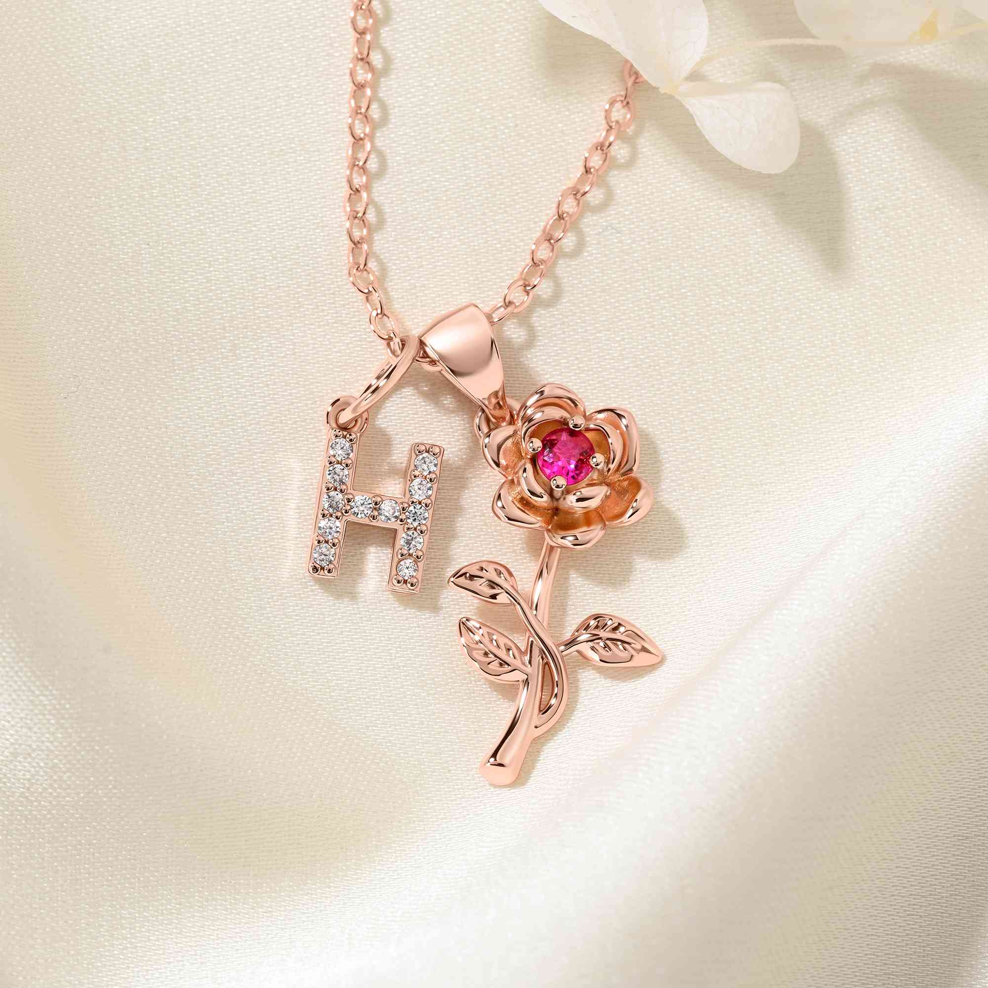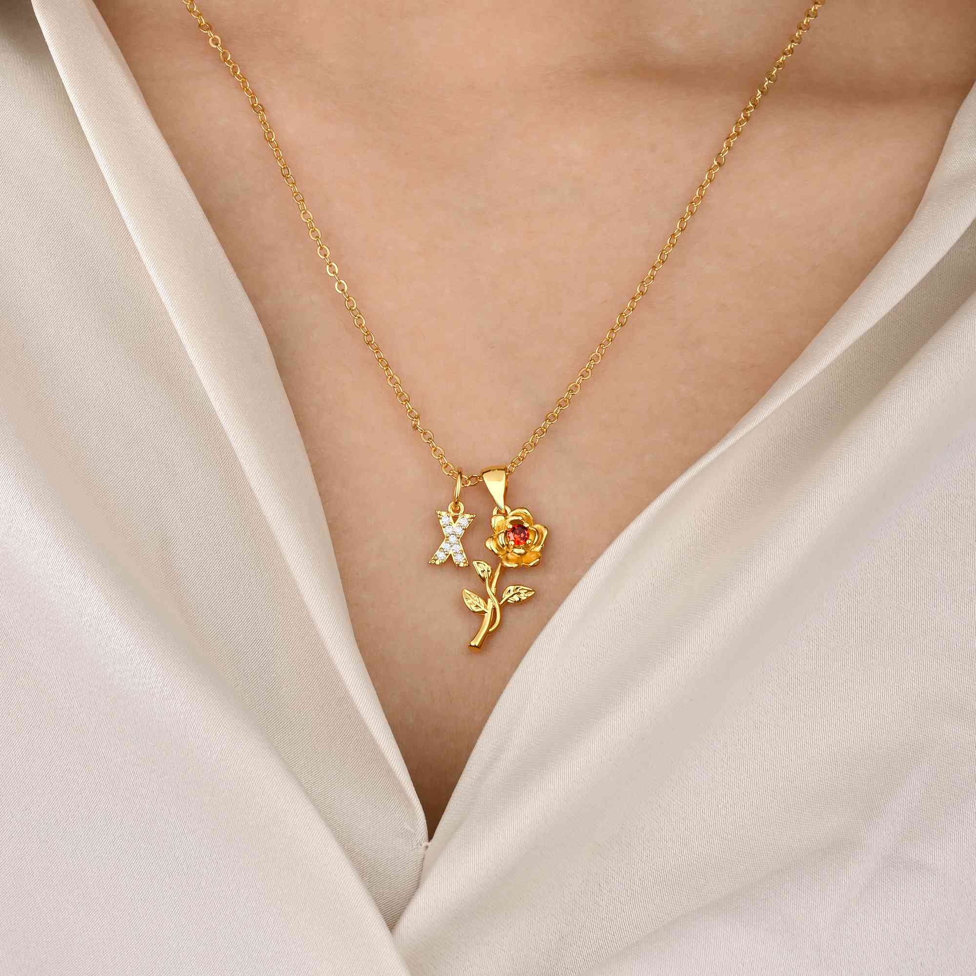 Elegant Rose & Initial Design – This delicate necklace features a beautifully crafted rose pendant with a sparkling gem at its center, symbolizing love and beauty. A personalized initial charm hangs beside it, adding a touch of individuality and sentiment.